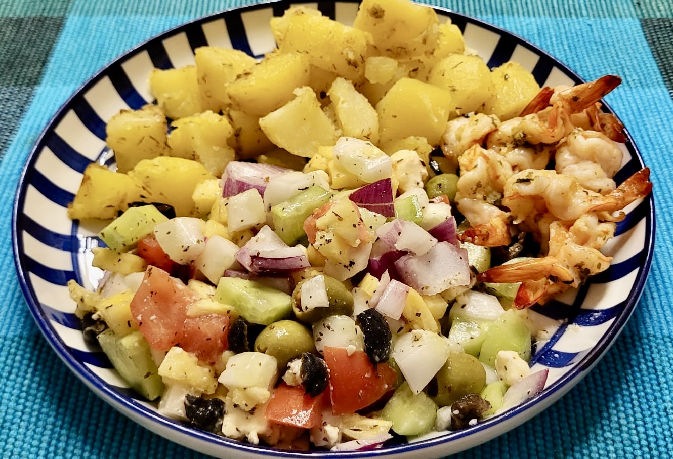- We offer our Poyamoon salad served with fresh bread. It features small pineapple pieces blended with a touch of mint, combined with a traditional Greek-style mix of cucumber, red onion, tomato, and peppers, finished with feta cheese and a drizzle of olive oil. If you’d like to add extras such as prawns, we can happily arrange that.