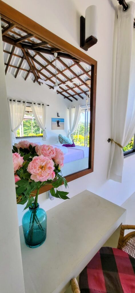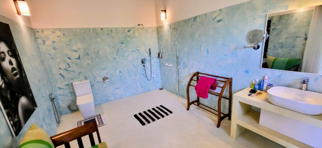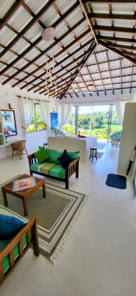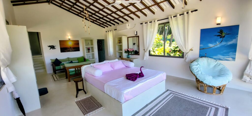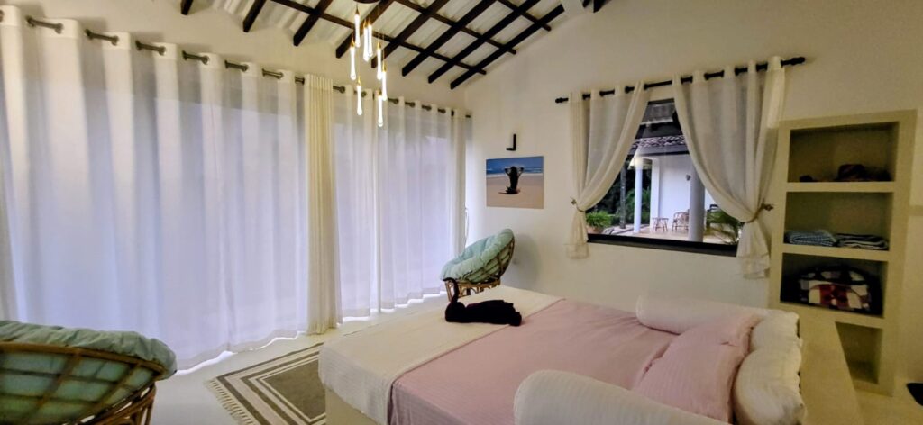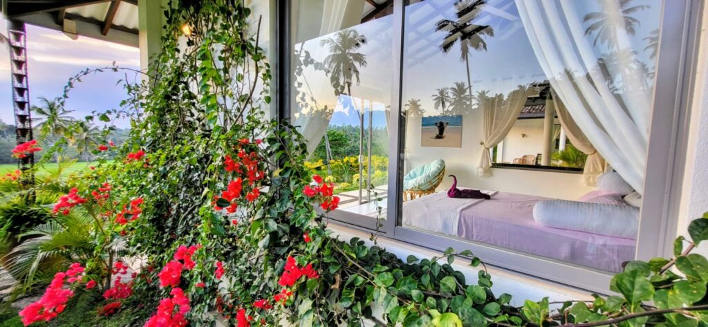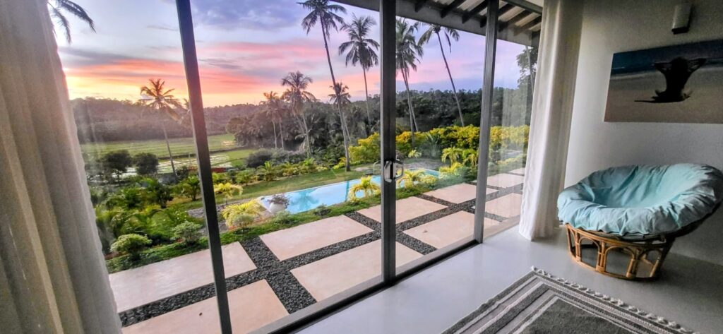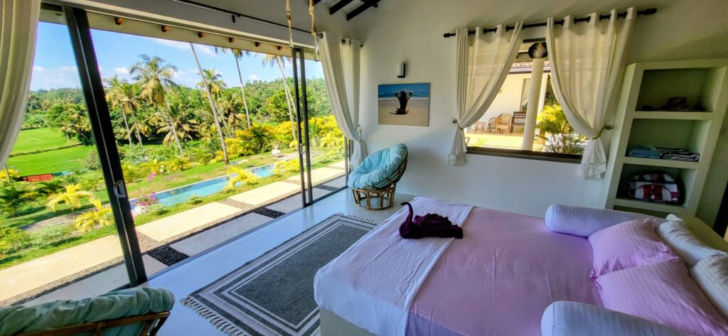 The bed a super king size with an additional 6 inches length for any tall guests ( as are all beds), includes built-in lighting and fan controls for ease and comfort. At sunrise, draw back the curtains and watch as the sky blushes with soft colours that spill over the palms and rice fields. Depending on the season, the paddy fields sway in the breeze — a mesmerising sight that feels almost dreamlike.