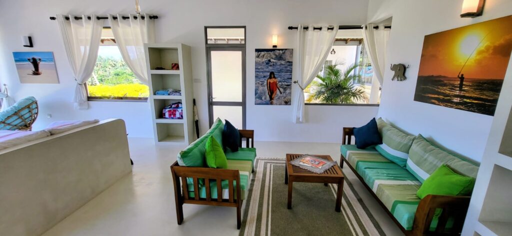Floor-to-ceiling French doors open from the centre, letting in a refreshing breeze. Another door leads onto the veranda, where there is seating and a table along with the tropical fishes whom are pet like as they are always keen to say hello to you. There are floating steps from the room that connects you to the TV room above. All doors are fully lockable, ensuring your privacy, safety, and a constant feeling of calm and control.