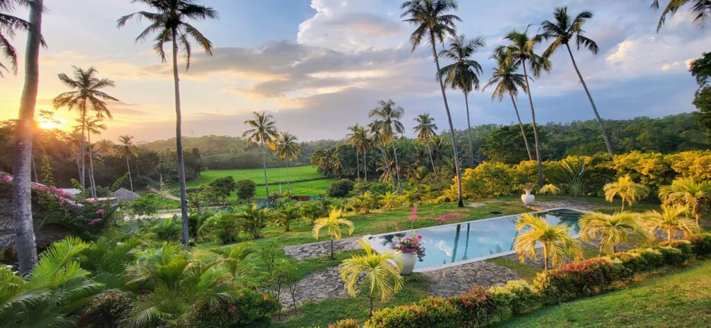 Spacious circular wicker chairs invite you to settle in and watch the world outside — elegant peacocks wander gracefully through the gardens, while kingfishers and parrots add vibrant flashes of colour against the green of the paddy fields. The villa’s natural beauty feels alive here, yet deeply peaceful.
