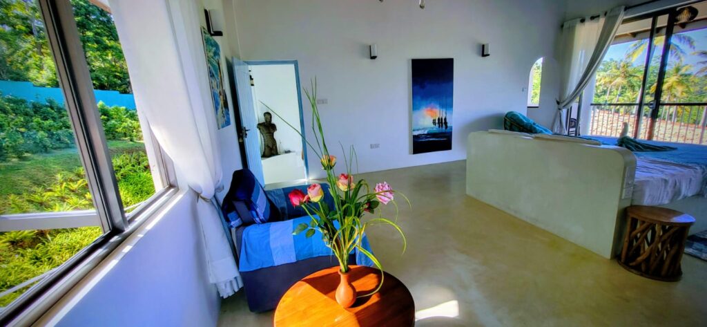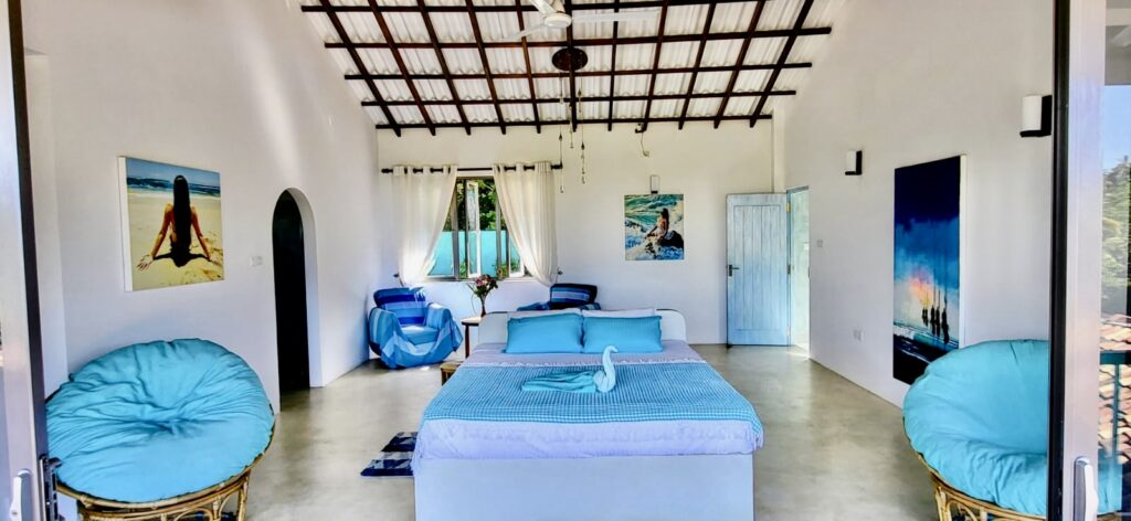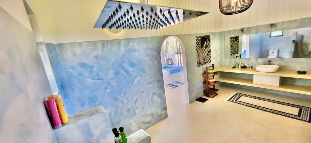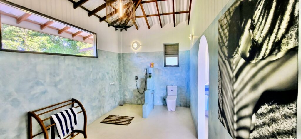 There is no air conditioning in this room by design — instead, the gentle movement of air and the quiet hum of the ceiling fan, placed directly above the bed, create a soothing rhythm that lulls you into deep rest. The warmth of the tropical air and climate stimulated by the fan create a wonderful combination that makes falling asleep very easy. The owner prefers to sleep with the doors wide open and only ever closes them if the weathers being inclement and as its never over looked he rarely closes the curtains.