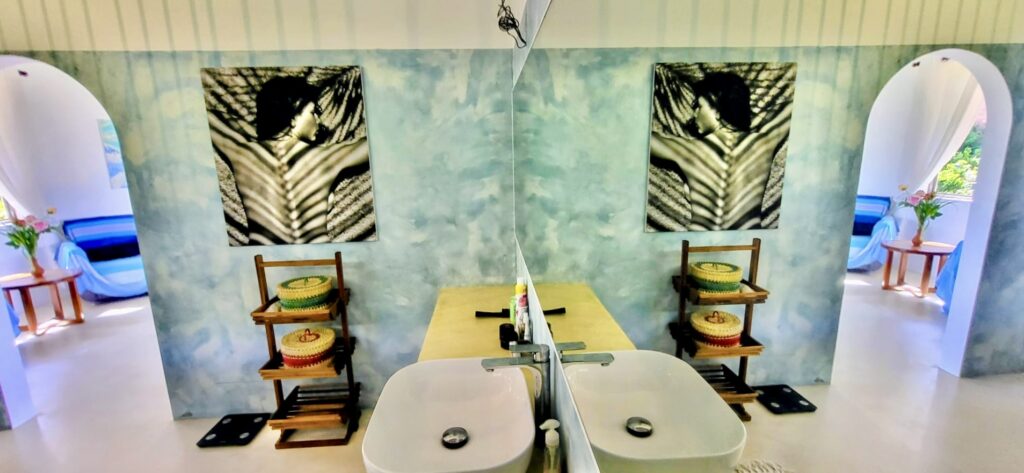 The bathroom is wonderfully spacious, offering a serene retreat where the shower can be enjoyed cool and refreshing or warm and soothing, depending on your mood. Its soft Greek-inspired design creates an atmosphere of gentle elegance, with the owner’s love for Greece woven into every corner. The authentic wool rugs—brought from the misty mountains of Corfu—add a touch of rustic charm, while the photographs in the master bedroom and shower are truly exceptional. Captured by the semi-professional photographer owner, they are among the most artistic and evocative images in the entire villa, adding a deeply personal and romantic touch.