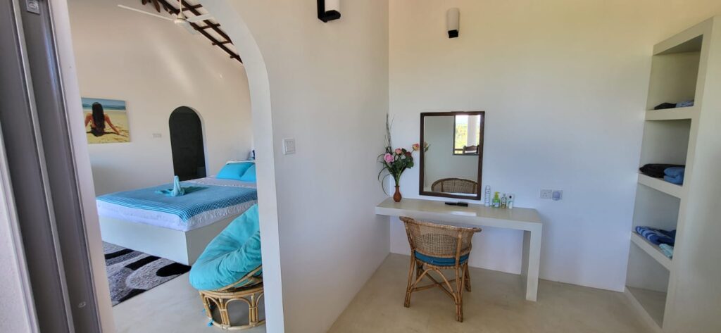 Nearby, a rather quaint walk-in dressing area awaits. Thoughtfully arranged with graceful shelving and a place to hang your favourite pieces, it’s the perfect spot to linger while getting ready. The mirror and chair create a romantic little corner for those final touches, whether you’re preparing for a sun-kissed morning or a magical evening under the stars.