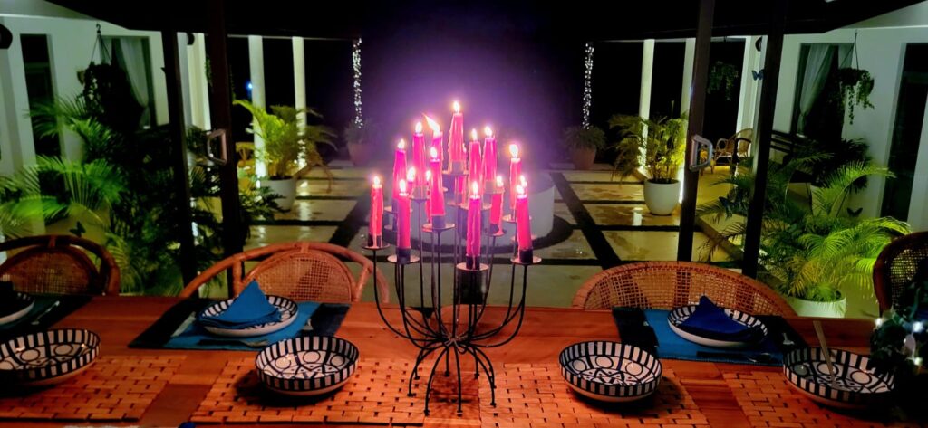 Here, time slows. You can listen to music, enjoy soft conversation, or rest in silence beneath the steady hum of the overhead fans. As dusk approaches, the resident peacocks announce their return to the palm trees for the night — a charming daily ritual that gently marks the close of day.